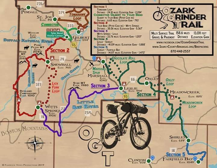 The Middle Fork offers a number of unique characteristics due to the rail road bed running the river, that was abandoned by the Missouri and North Arkansas Railroad that ran between Joplin and Helena. There is still one active bridge from the railroad days being used in Shirley and a number that were abandoned after the flood of 1982. This railroad bed has many uses from ATV trail riding to being the bottom end of the Ozark Grinder Trail (a mountain bike trail stretching 125+ miles from Tyler bend north of Marshall to Shirley).